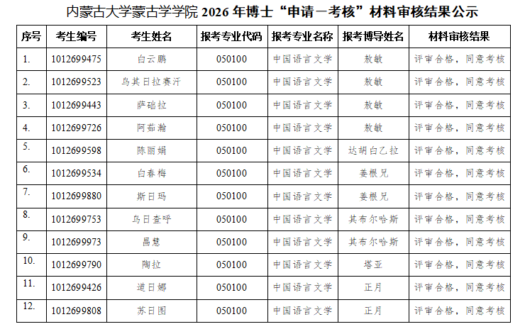 内蒙古大学蒙古学学院2026年博士“申请-考核”材料审核结果公示