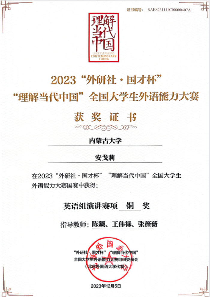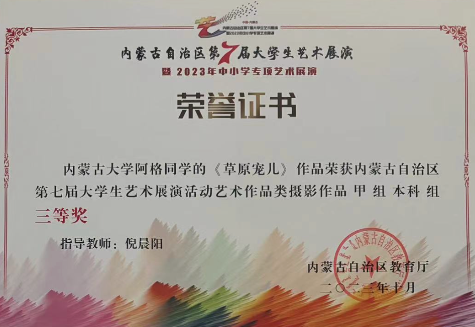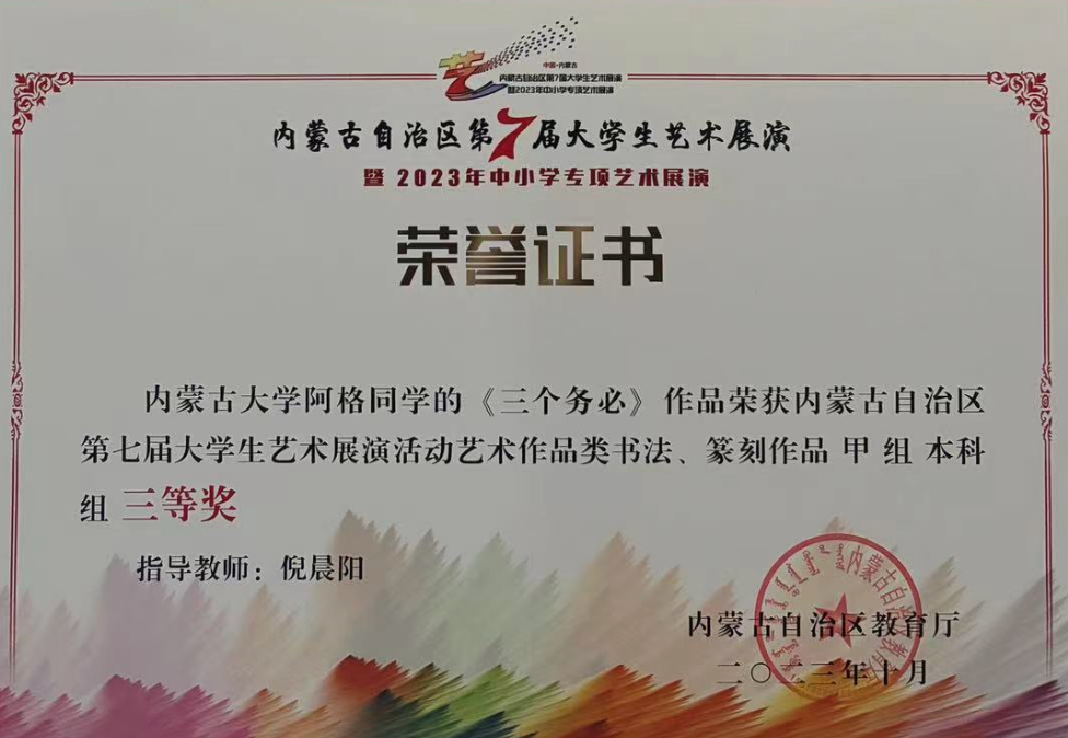 我院学生积极参加校内外种类竞赛,并取得优异成绩。2021年 ,我院本科生阿格荣获内蒙古自治区第六届大学生艺术展演活动艺术作品类书法作品大赛三等奖;2021年,嘎力娃同学荣获全国第八届青年摄影大赛优秀奖;2023年,安戈莉同学荣获 “外研社·国才杯”全国大学生外语能力大赛(演讲)国赛铜奖;2023年,获第十三届“挑战杯”全区大学生课外学术科技作品竞赛特等奖1名;2023-2024年全国青少年校园足球联赛大学男子校园组全国总决赛(CUFA)中,内蒙古大学男子校园组足球队夺得亚军,实现自治区高校足球队参加全国赛事新的历史性突破。本次大赛,我校共派出24名队员,其中18名为蒙古学学院学生。