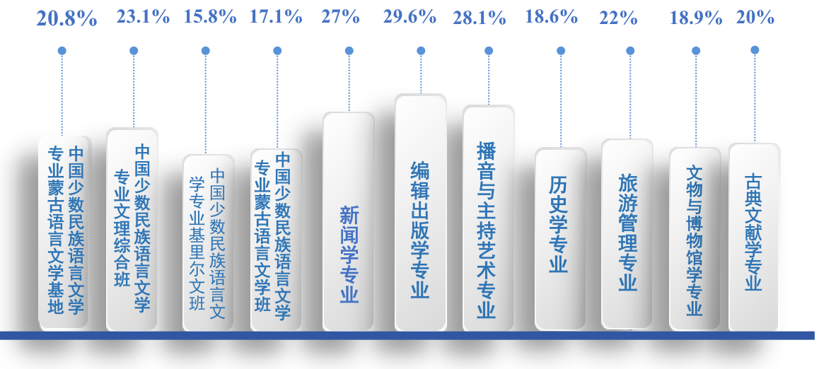 蒙古学学院注重学生应用能力和实践动手能力的培养,建立了与理论教学密切结合的实践教育体系,在培养方案中对标各专业的本科教学质量国家标准,保证了学生实践教学学分。蒙古学学院各专业班级的实践教学环节占总学分比例如下所示。
