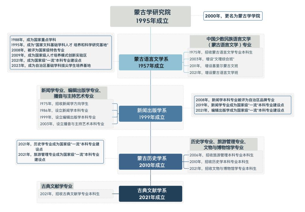 蒙古学学院下设蒙古语言文学系、新闻出版学系、古典文献学系、蒙古历史学系、公共课教学部、蒙古语文研究所、蒙古文化研究所、蒙古史研究所、内蒙古近现代史研究所、蒙古史档案文献中心、蒙古高原历史地理与科技考古研究中心等11个教学科研机构,设立中国少数民族语言文学、新闻学、编辑出版学、播音与主持艺术、古典文献学、旅游管理、历史学、文物与博物馆学等8个本科专业。1995年,中国少数民族语言文学(蒙古语言文学)专业成为“国家文科基础学科人才培养和科学研究基地”,同时被列入国家“211工程”重点建设学科。2023年,该 专业成为自治区基础学科拔尖学生培养基地。现有中国少数民族语言文学、新闻学、编辑出版学、历史学、旅游管理专业等5个国家级一流本科专业建设点。